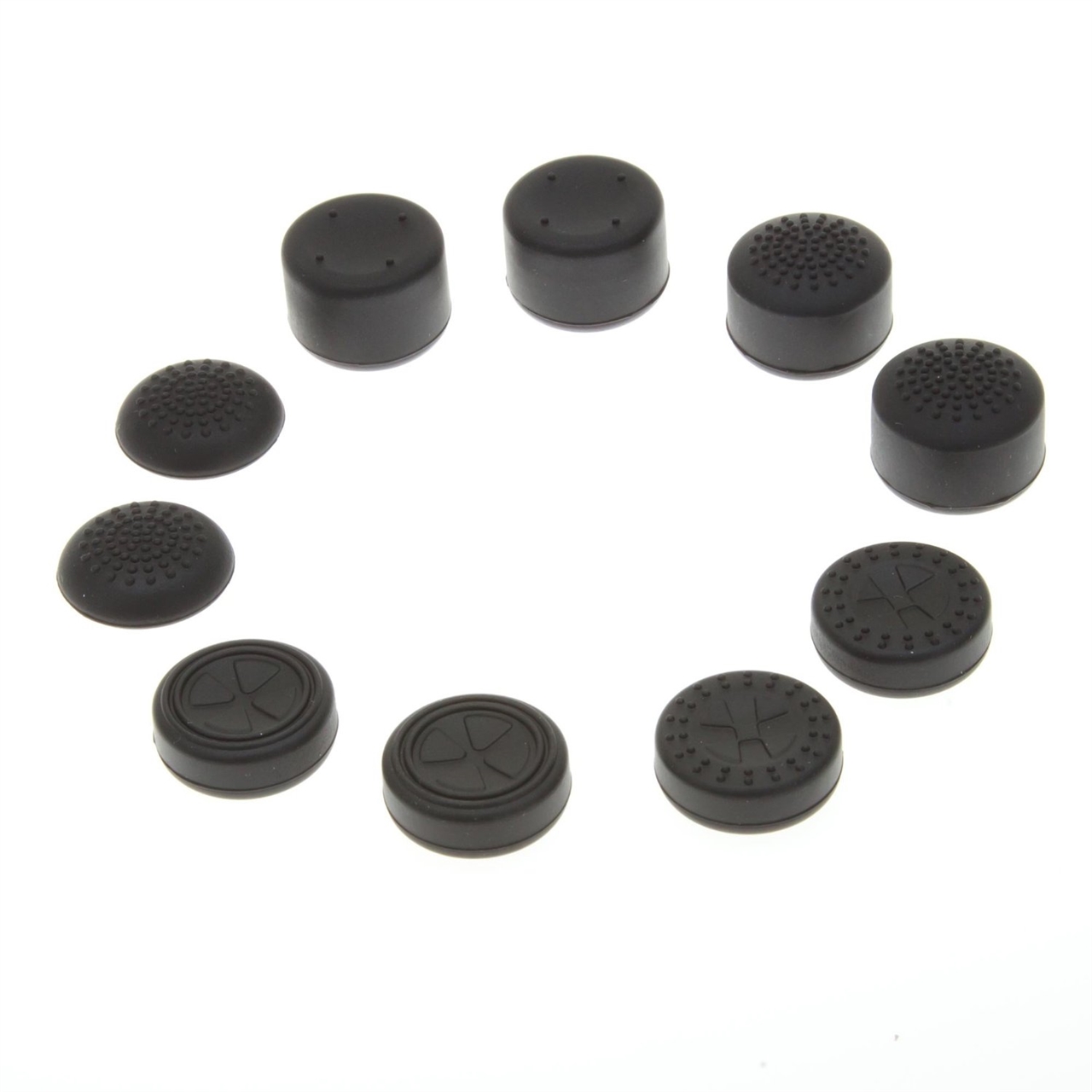A pack of ten thumb grips. 5 different sets (1 low, 2 medium high and 2 high)